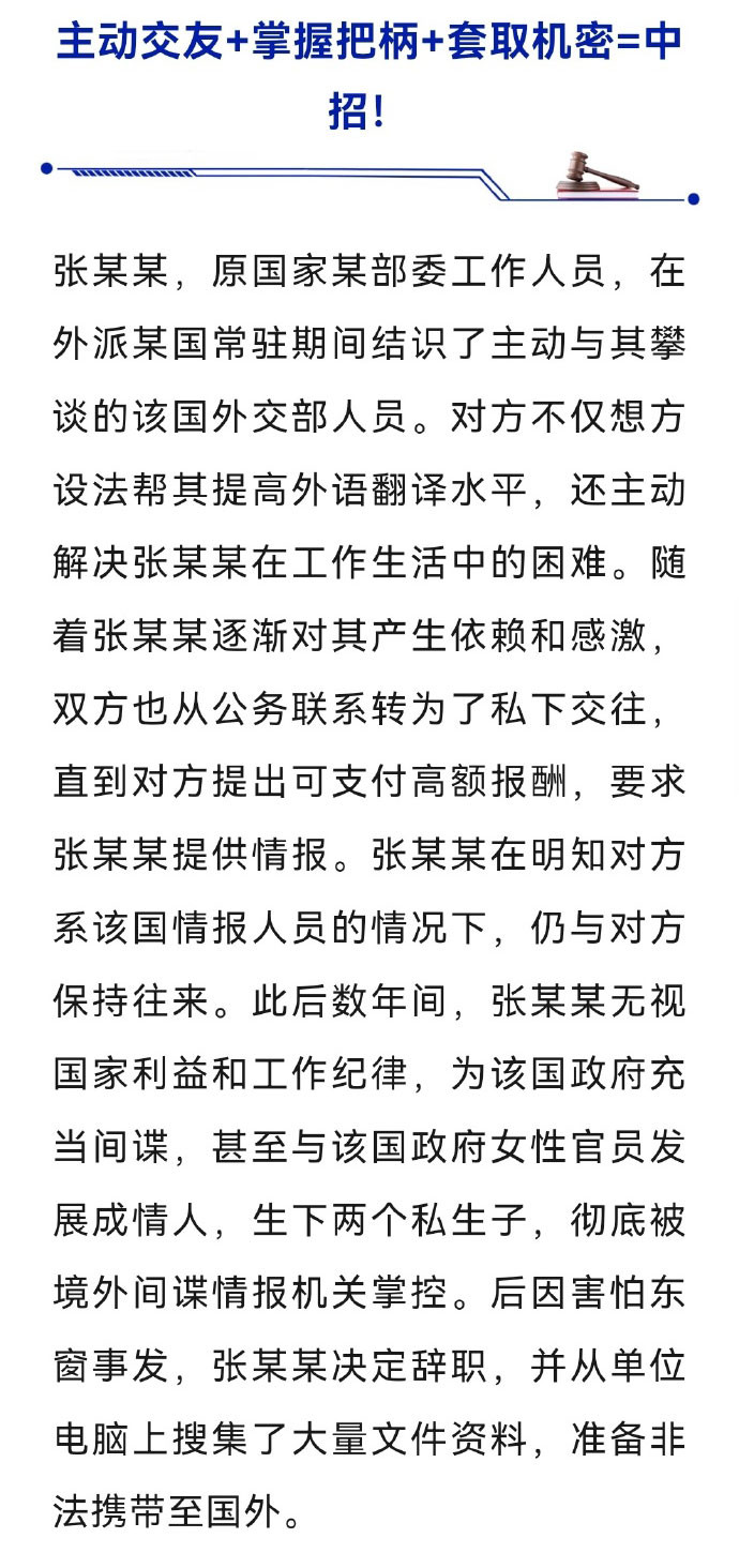 张某某的案例则暴露出"利益绑架"的陷阱。外籍间谍以"导师"身份出现,三年间为其支付外语培训费、解决子女教育、提供高端医疗,逐步将"人情债"转化为"情报债"。这种"养肥再杀"的策略之所以奏效,在于抓住了体制内人员的心理需求——对"被认可"的渴望、对"解决实际困难"的感激、对"更高层次关系"的幻想。当张某某第一次为对方翻译文件时,他或许用"只是举手之劳"来自我安慰;当他私存5200份文件时,或许用"反正没泄露核心内容"来麻痹自己。直到东窗事发,他才惊觉自己早已沦为间谍网络的"神经末梢"。
