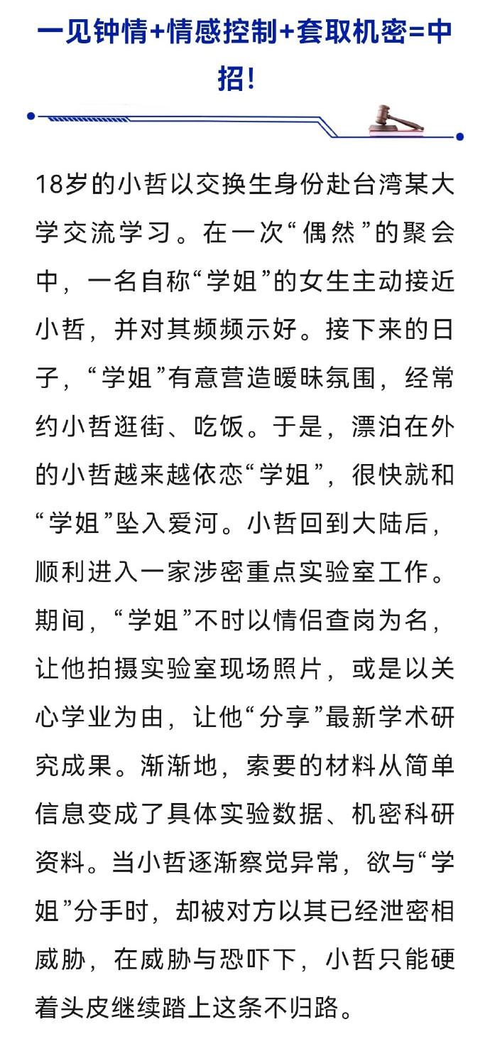 值得关注的是,两起案件的共性在于间谍机构对目标群体的心理画像极其精准。针对学生,他们用"爱情"和"学术合作"包装;针对职场人,他们用"帮助"和"资源交换"渗透。这种"定制化陷阱"的高明之处,在于让受害者从"被动接受"变为"主动配合"——小哲会主动拍摄实验室照片,张某某会主动搜集绝密文件,甚至在被威胁后仍选择"继续完成任务"。当"情感依赖"和"利益绑定"超越原则底线,个体的判断力便彻底崩塌。
